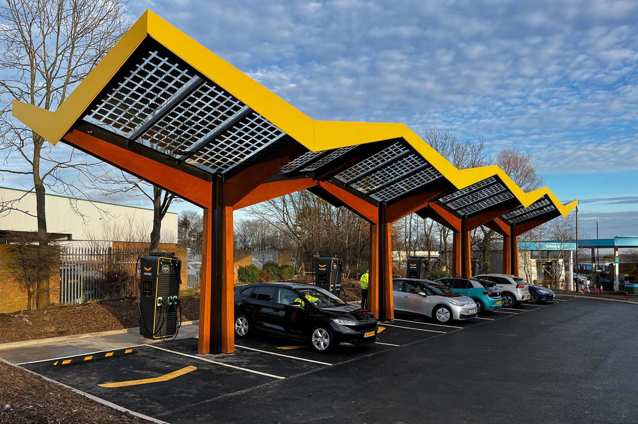 The new station features eight ultra-rapid charging points offering speeds of up to 300kW, with the site powered by 100% renewable energy sourced via a solar canopy that sits above the charging hub.
