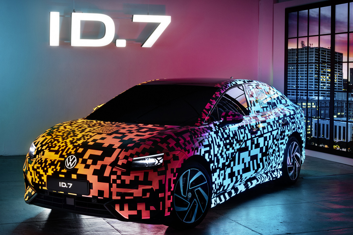 Now, if the ID 7 looks familiar, that’s because it was closely previewed by the ID Aero concept car that was revealed last year. This latest model is based on the eventual production car, and the snazzy camo livery – which features light-up electroluminescent paint – is there to hide some of the details before a full reveal in the coming months.