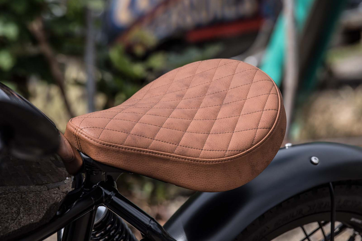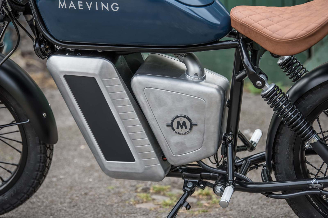 Maeving believes it has made a bike with more British components than any other bike maker – sourcing from the UK wherever possible. It has a steel frame with a triangle suspended by twin shocks at the rear, and a small leather-like saddle. There’s a footpeg either side of the frame but the controls, like a scooter, are all operated from the handlebars rather than by the feet.