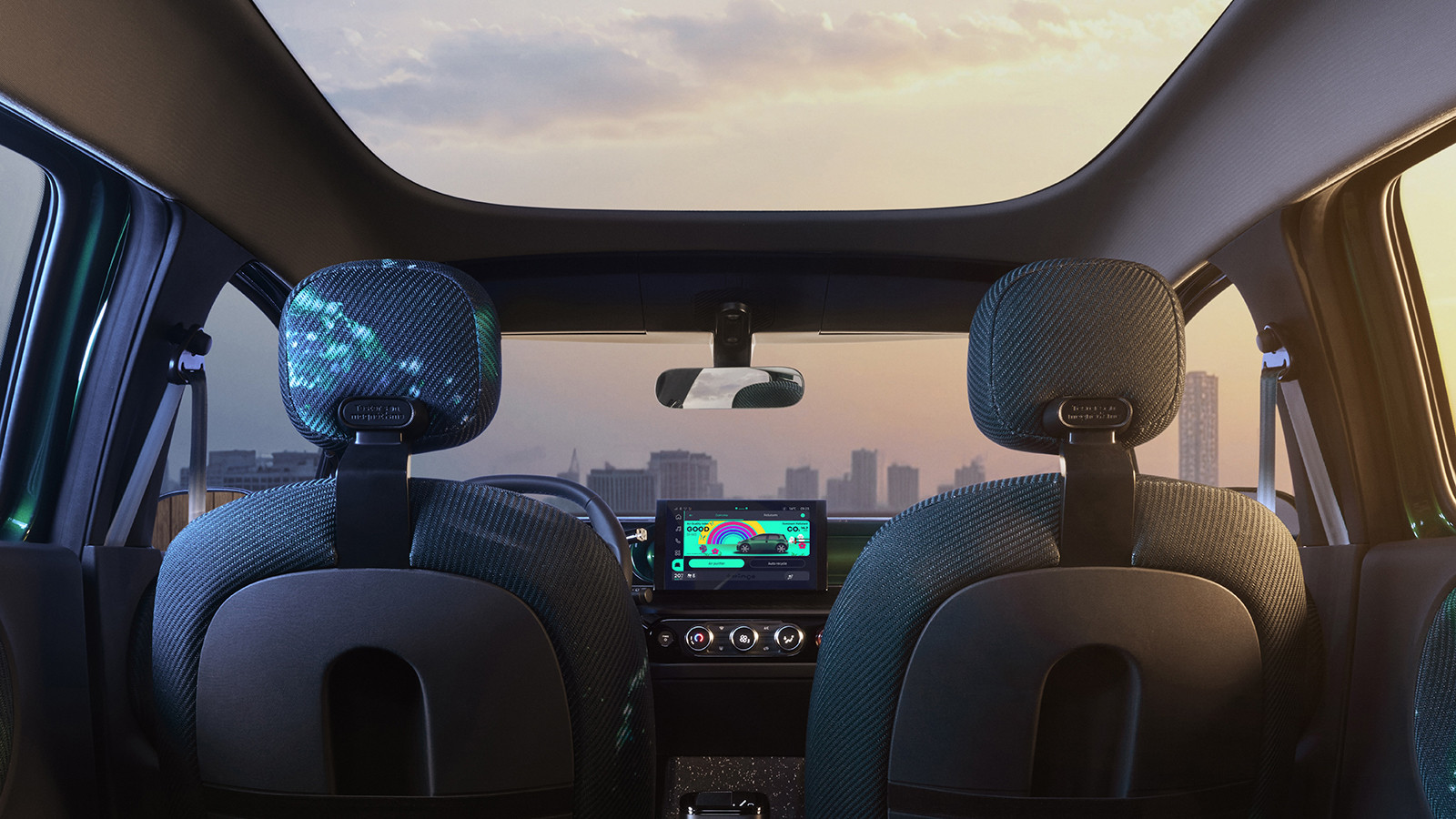 Renault describes the cockpit as "airy, cylindrical and suspended", with ovoid air vents and surfaces an obvious homage to the era-defining 1990s supermini. Notably, the seats of this new Twingo prototype are coloured to match the exterior paint, taking inspiration from the lurid upholstery options that were available on the old car.