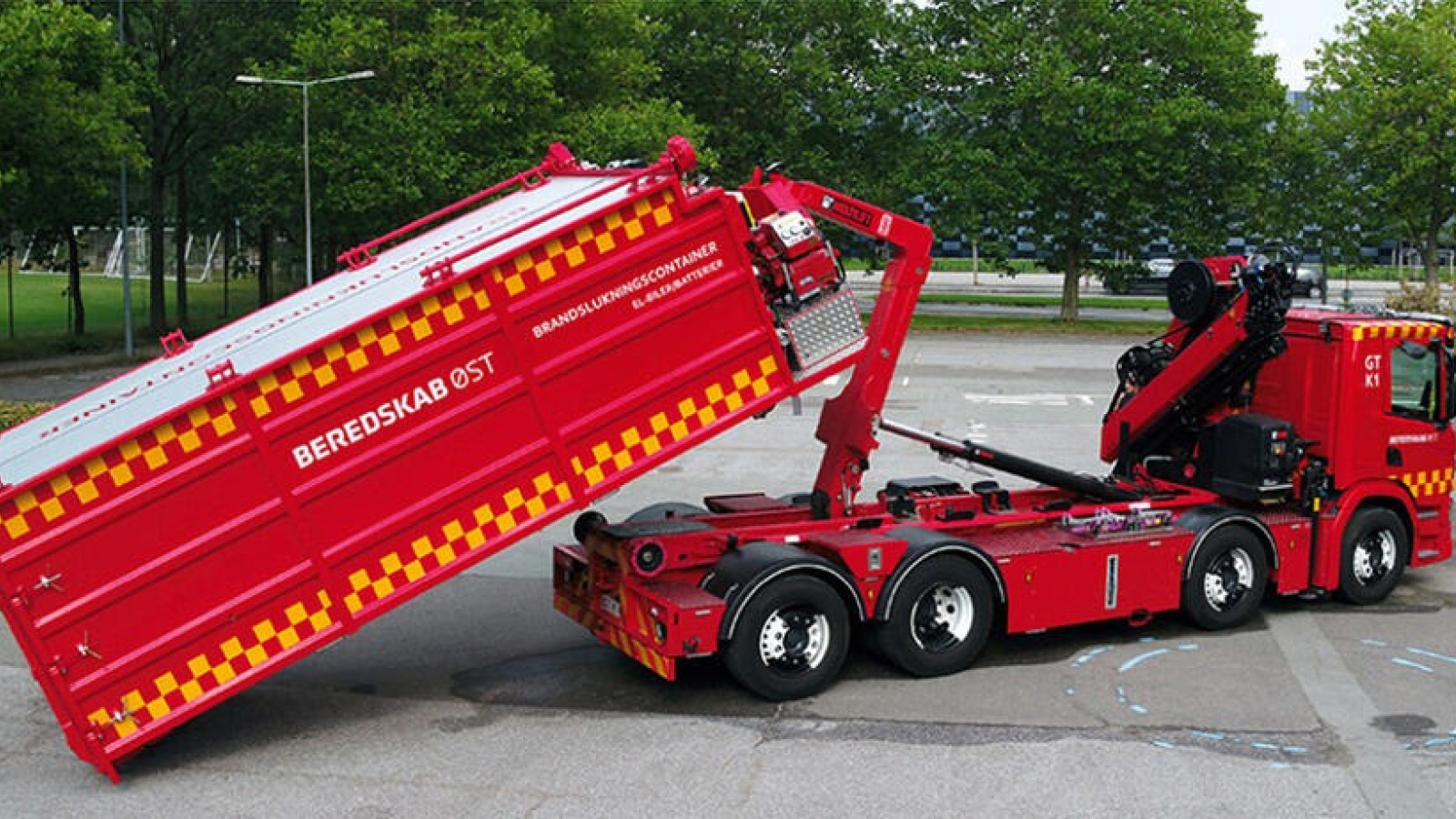 For electric cars that are on fire or at risk of being so, the fire service in Copenhagen, Denmark, has developed a truck-mounted vehicle containment solution, pictured above.