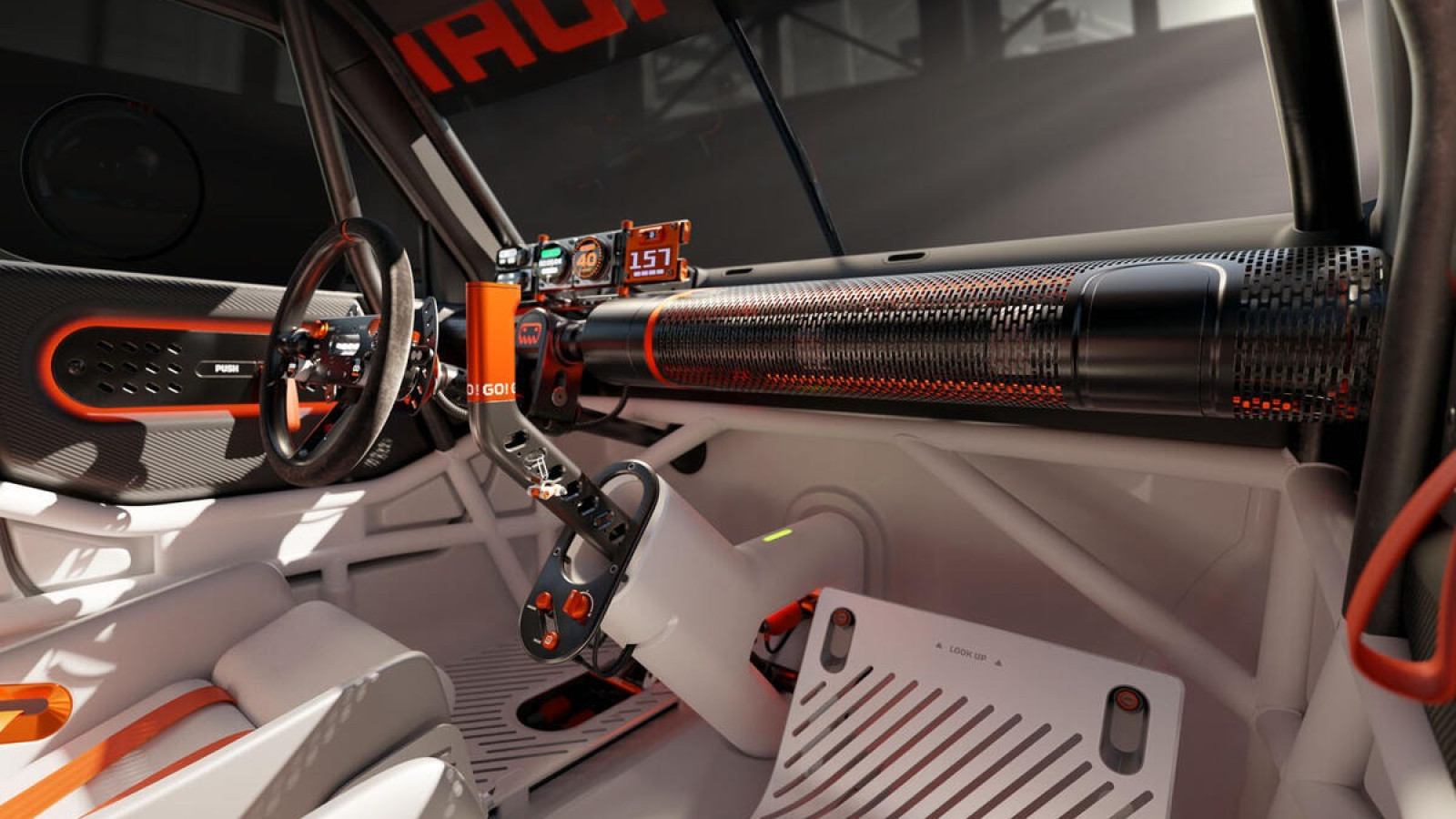 Inside, the Insteroid is stripped out and fitted with deep-set bucket seats, a roll cage and a hydraulic-style handbrake, hinting at the car’s performance intent.