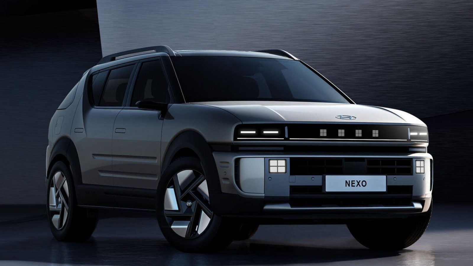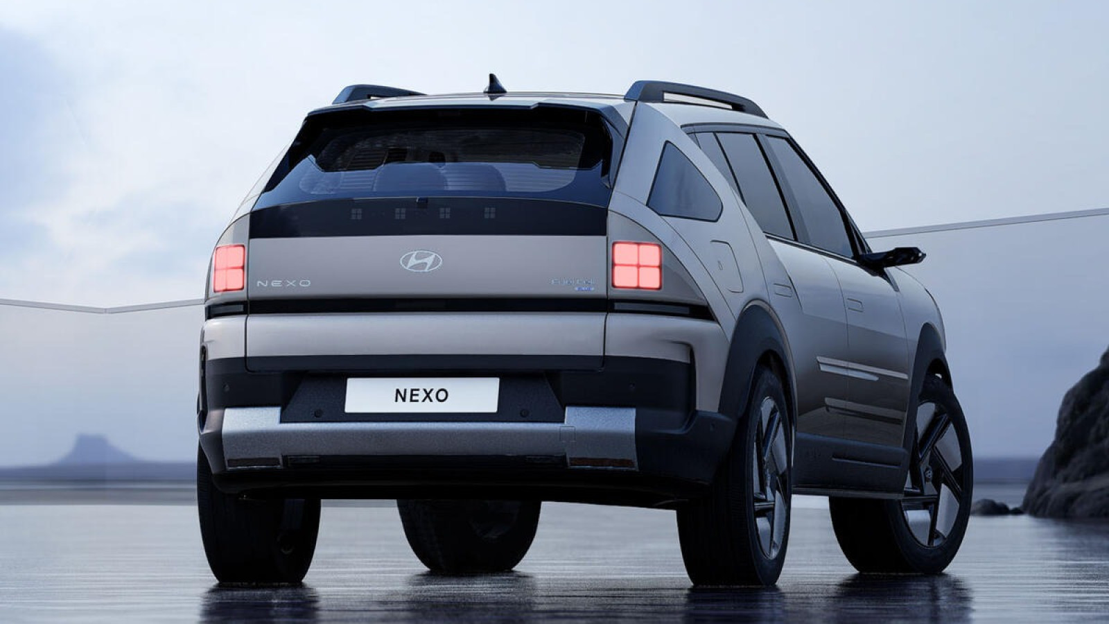 Details reserved for Hyundai’s new hydrogen cars include the new Nexo’s grid-shaped “H-two” front and rear lights, as well as H-shaped surfaces on the front and rear bumpers. The latter are finished in a flat silver shade, highlighting them against the colour of the car’s flat-black body cladding.